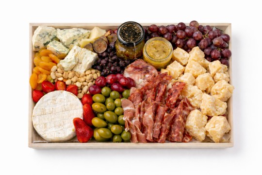 Prosciutto di Parma, Spicy Soppressata, Maytag Blue Cheese, Manchego, St. Andres Triple Creme, 24 Month Aged Parmigiano Reggiano, Fig Jam, Olives, Breadsticks, Artisan Crackers, Grapes, Marcona Almonds & Dried Fruit